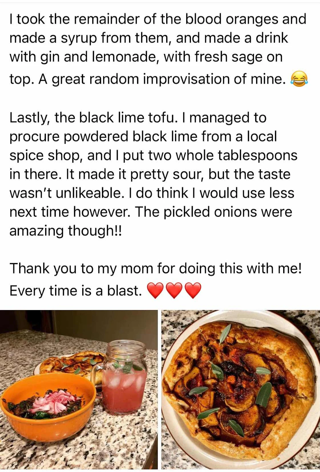 Saturday we stayed in and hung out hot tubbing and watching movies. On Sunday I spent four hours cooking with Valerie. We are still in the same cookbook so lots of yummy veggie meals. We made a Butternut squash and orange galette and Noor’s Black Lime Tofu! The tofu was over the top amazing.